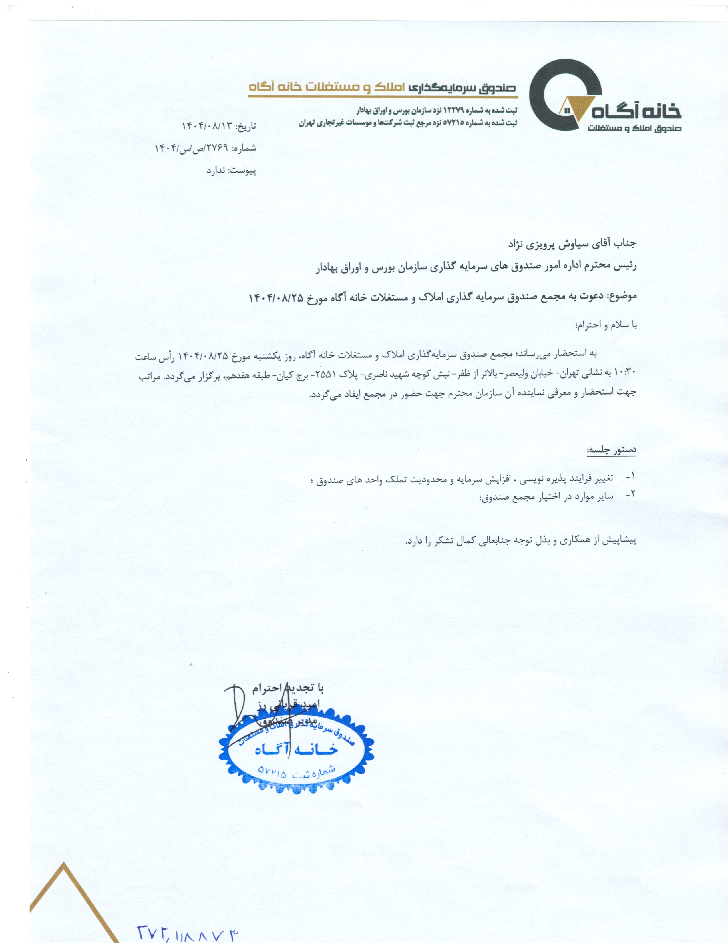 دعوت به مجمع صندوق املاک و مستغلات خانه آگاه مورخ ۱۴۰۴/۰۷/۰۲